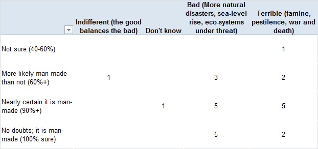 Team JB Survey - Certainty vs ScaleSo, what is it that makes someone feel that climate change is terrible, rather than merely bad? The language I used in the survey may be significant. I said that Bad meant more extreme weather, sea-level rise and eco-systems under threat, whereas I used more emotive language to describe Terrible, in terms of the four horsemen of the Apocalypse. I suspect that those who marked it as Terrible, including myself, are more emotionally engaged with the issue.