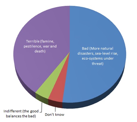 Turns out you think it is very bad indeed. The pre-Christmas survey shows that almost all of you think it is either Bad or Terrible. There are a couple of doubters, and the survey didn’t ask this question of those who didn’t think climate change is man-made in the first place. So, basically, if you think climate change is man-made, you think it is bad.